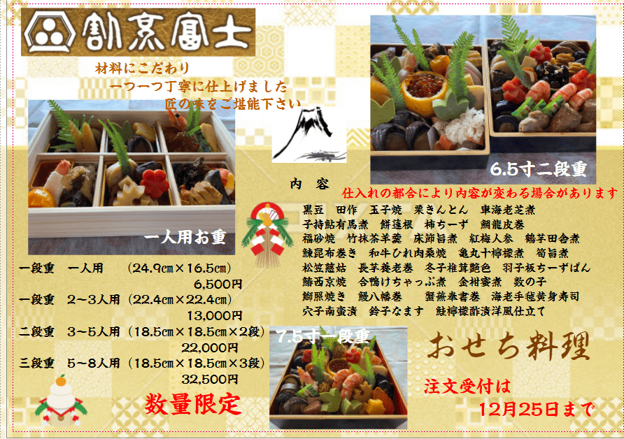 お陰様でおせち料理のご注文完売致しました。ありがとうございました。